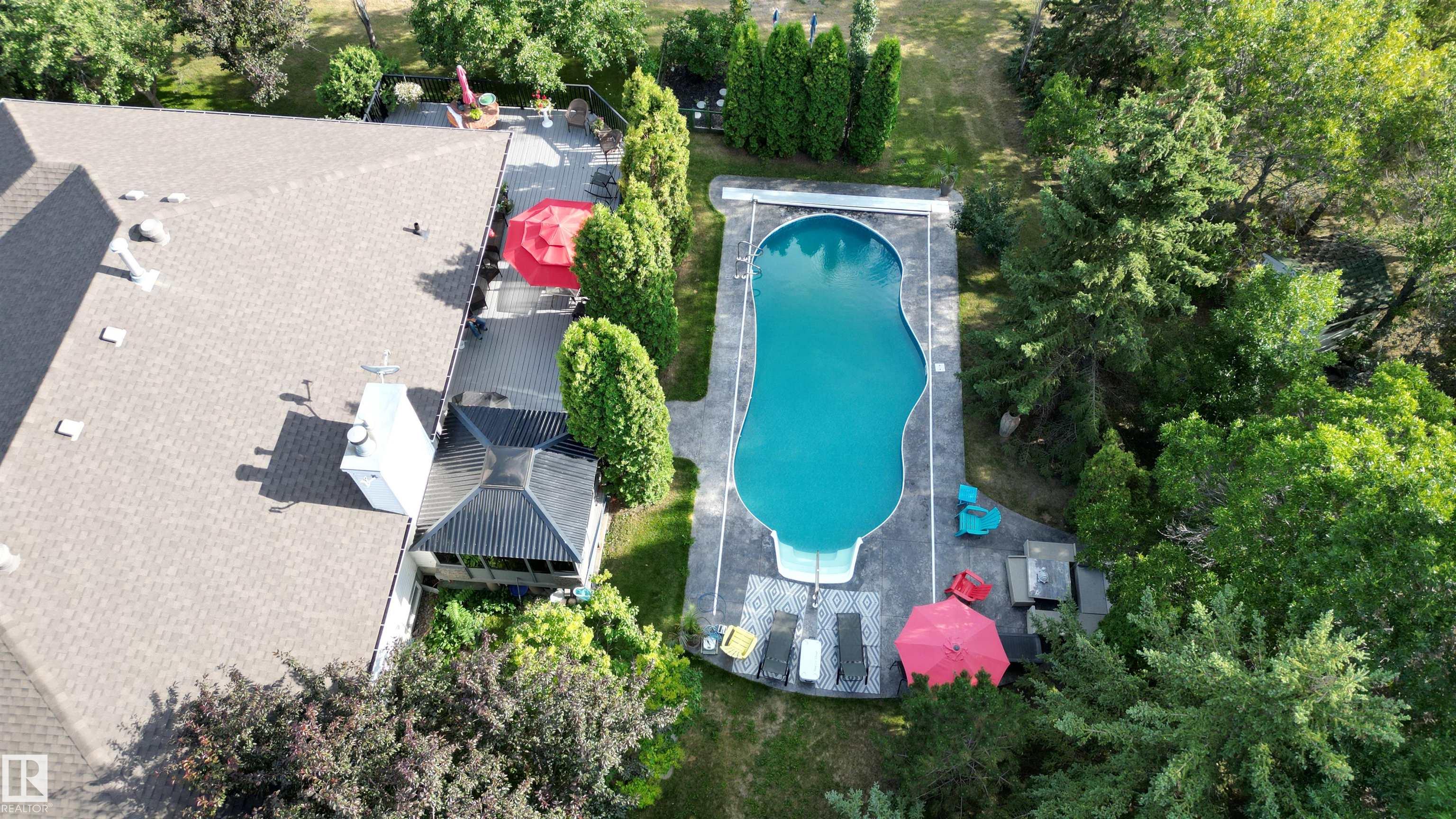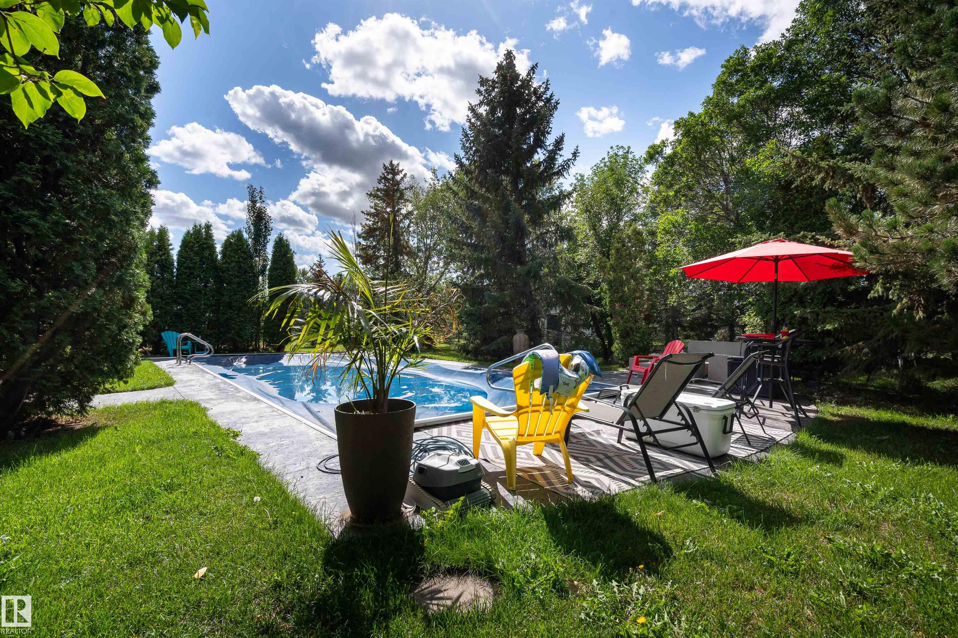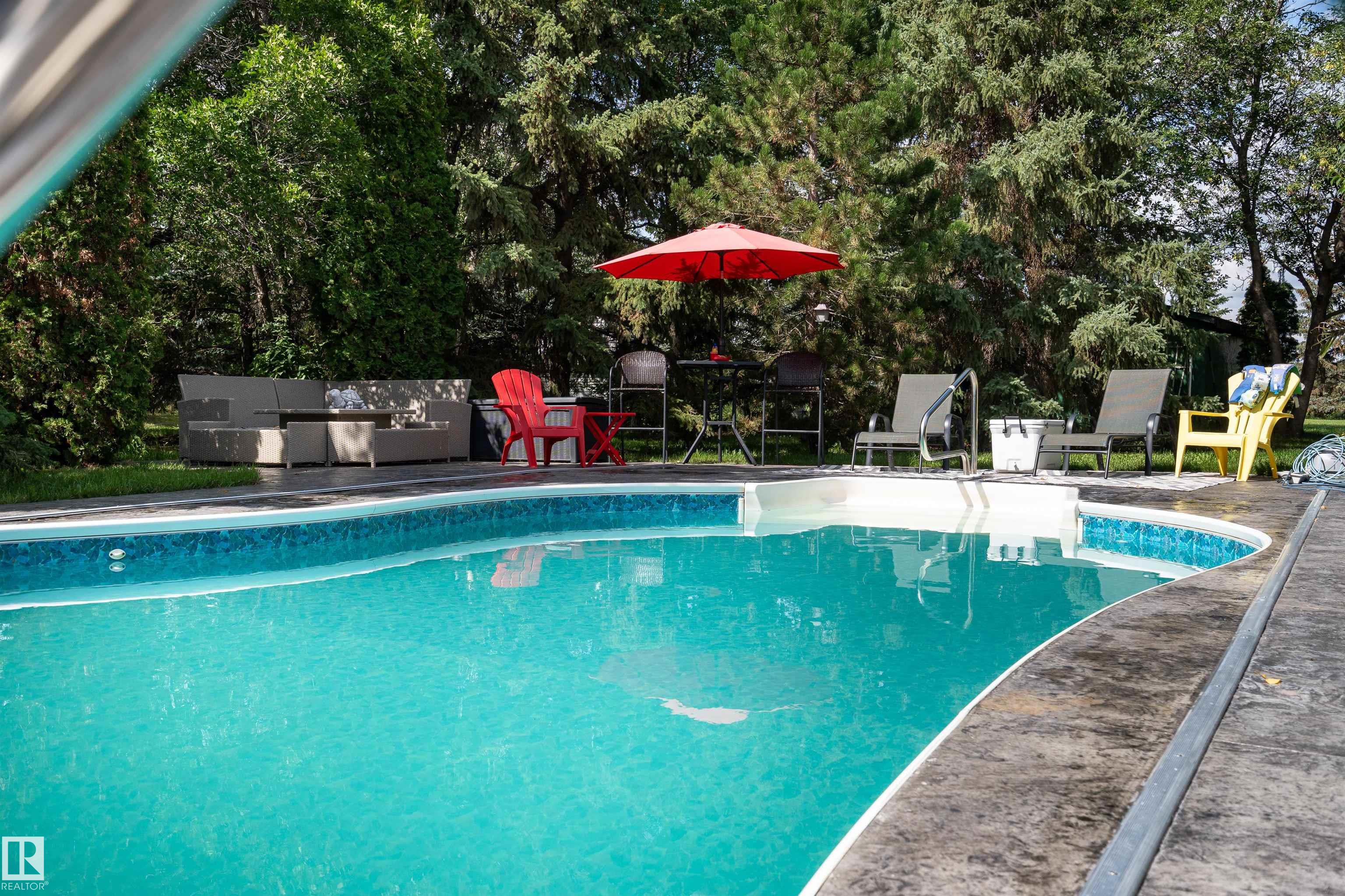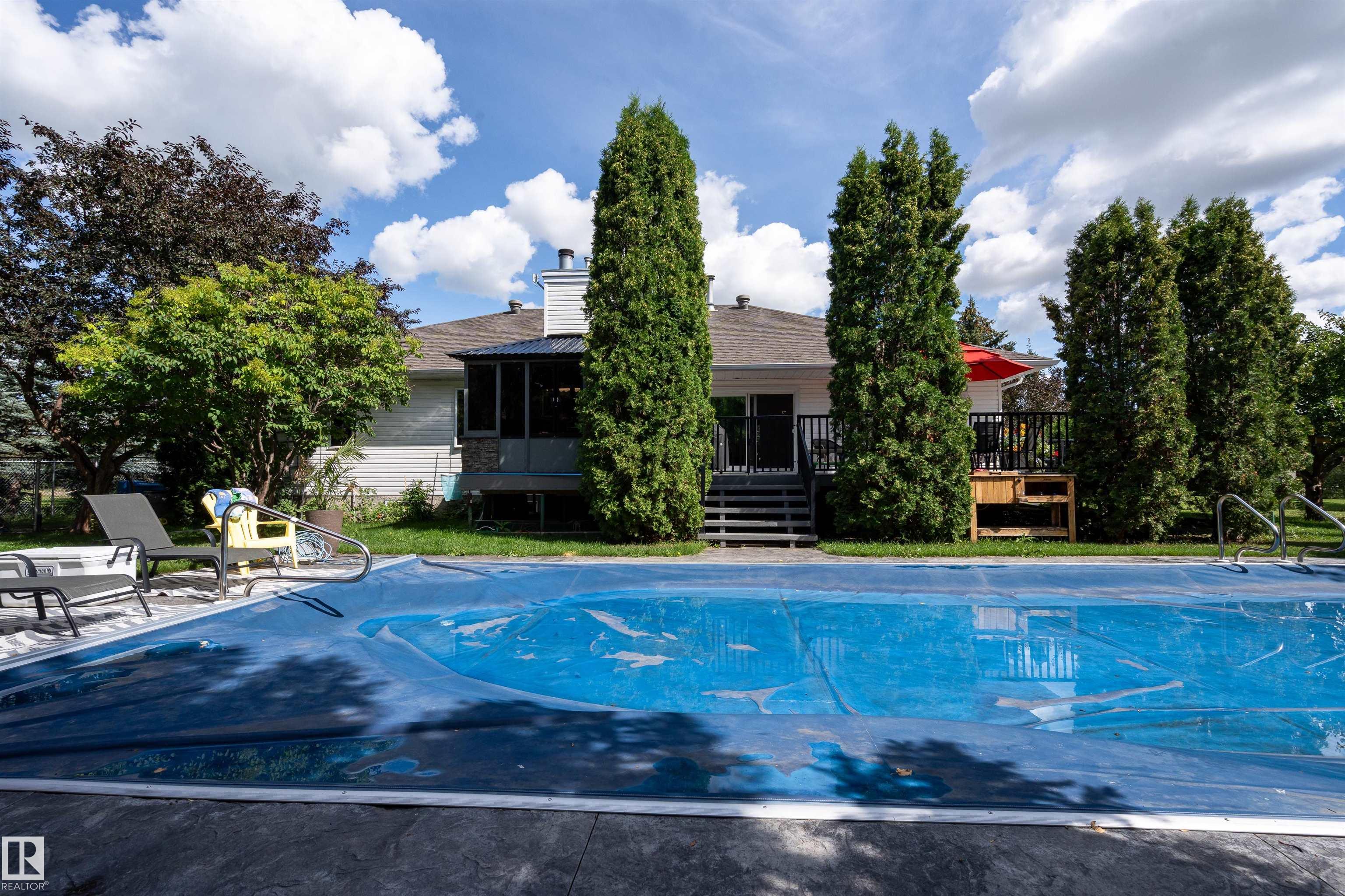 Welcome to Glenview Acres in Sturgeon County, just 5 minutes from Edmonton, where your private 15-acre retreat awaits. This 2,189 sq. ft. bungalow is thoughtfully designed for both relaxation and entertaining. The inviting country-style kitchen is built for gatherings, opening onto a spacious deck and sparkling heated pool with automatic cover. A warm, sunlit living room with a fireplace offers the perfect place to unwind. The primary suite is a true escape with a walk-in closet and 4-piece ensuite, complem...
