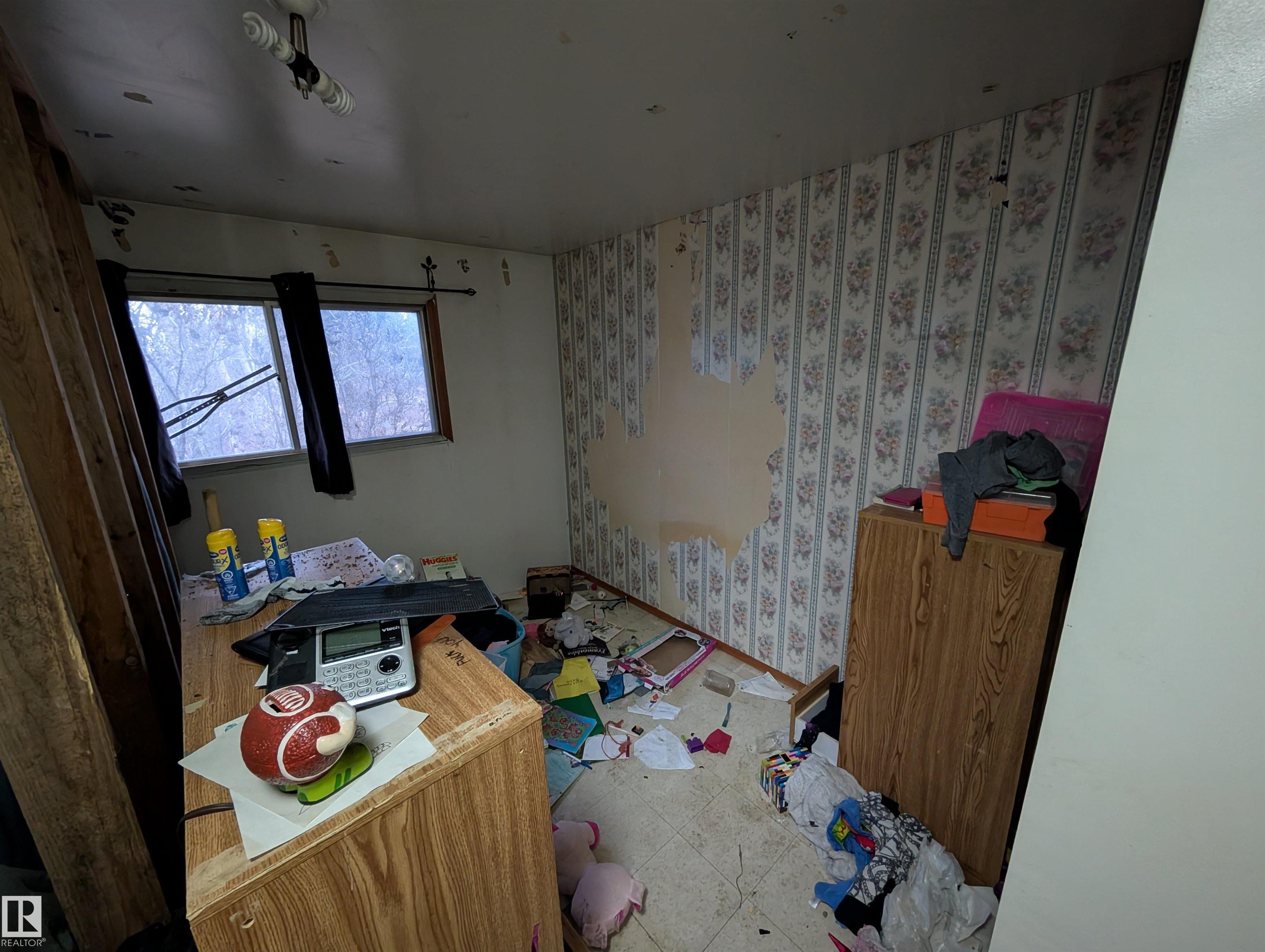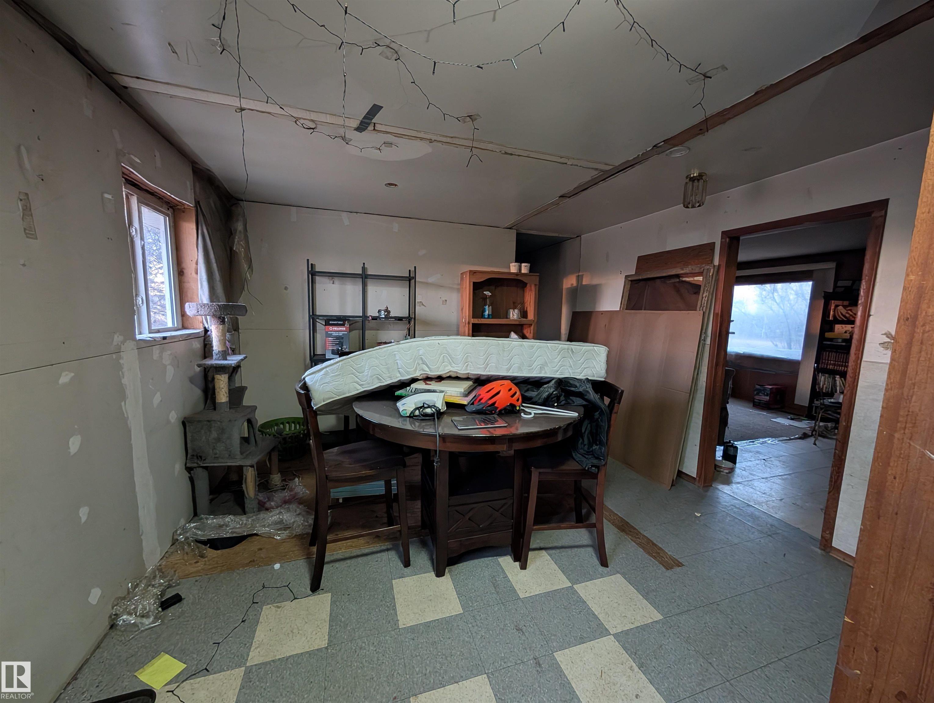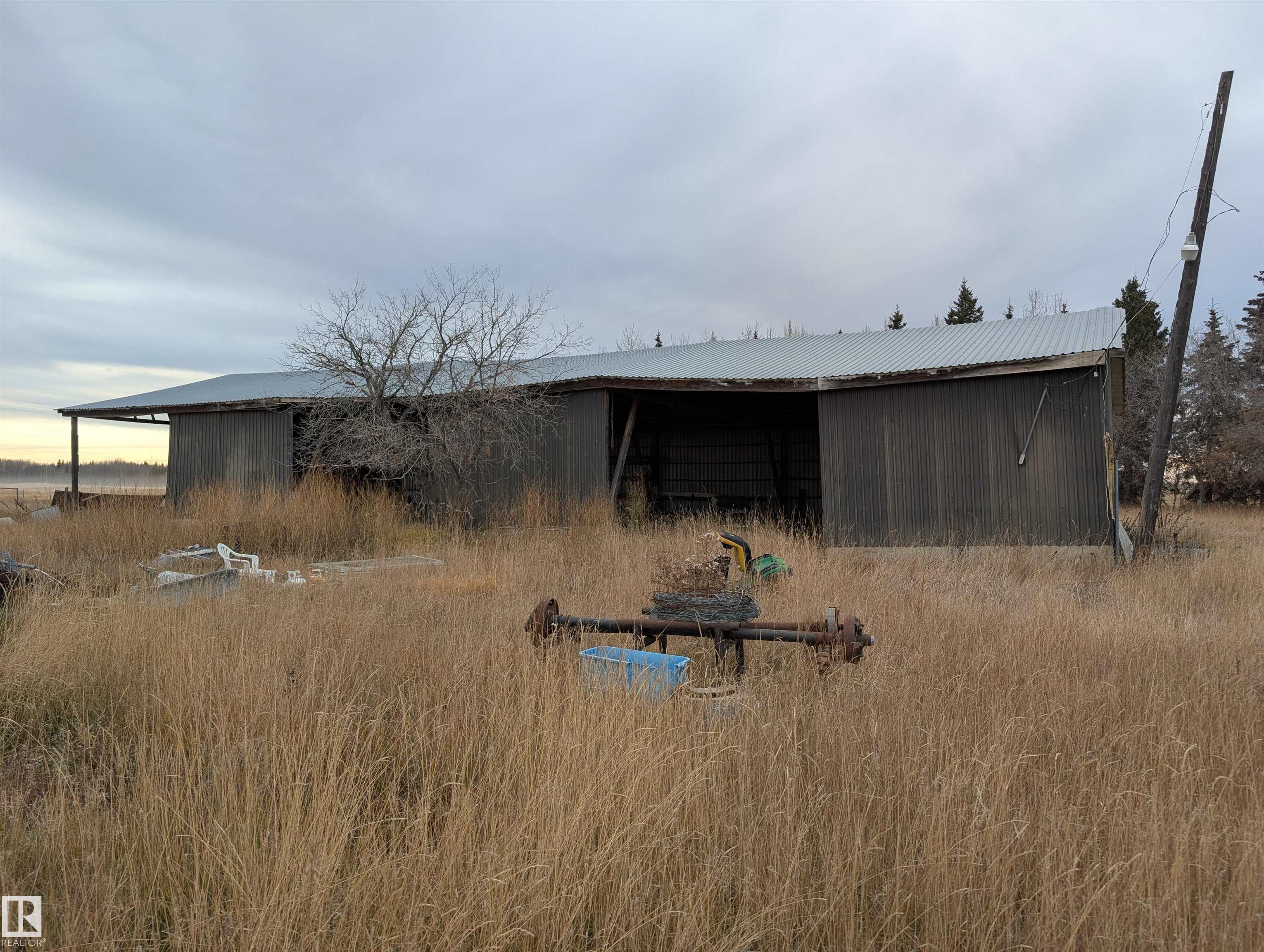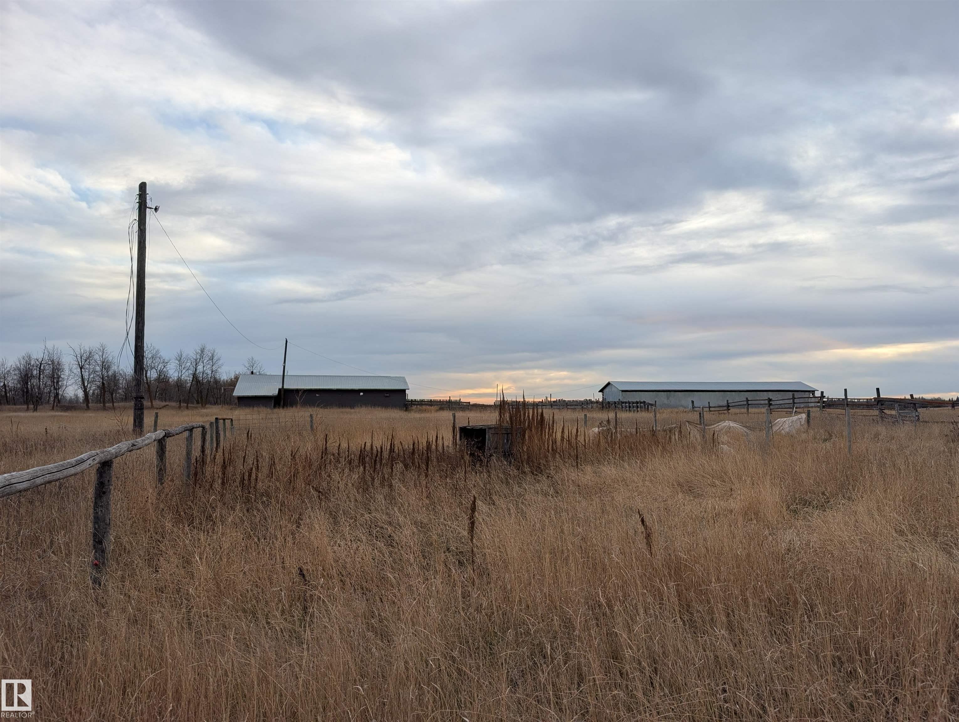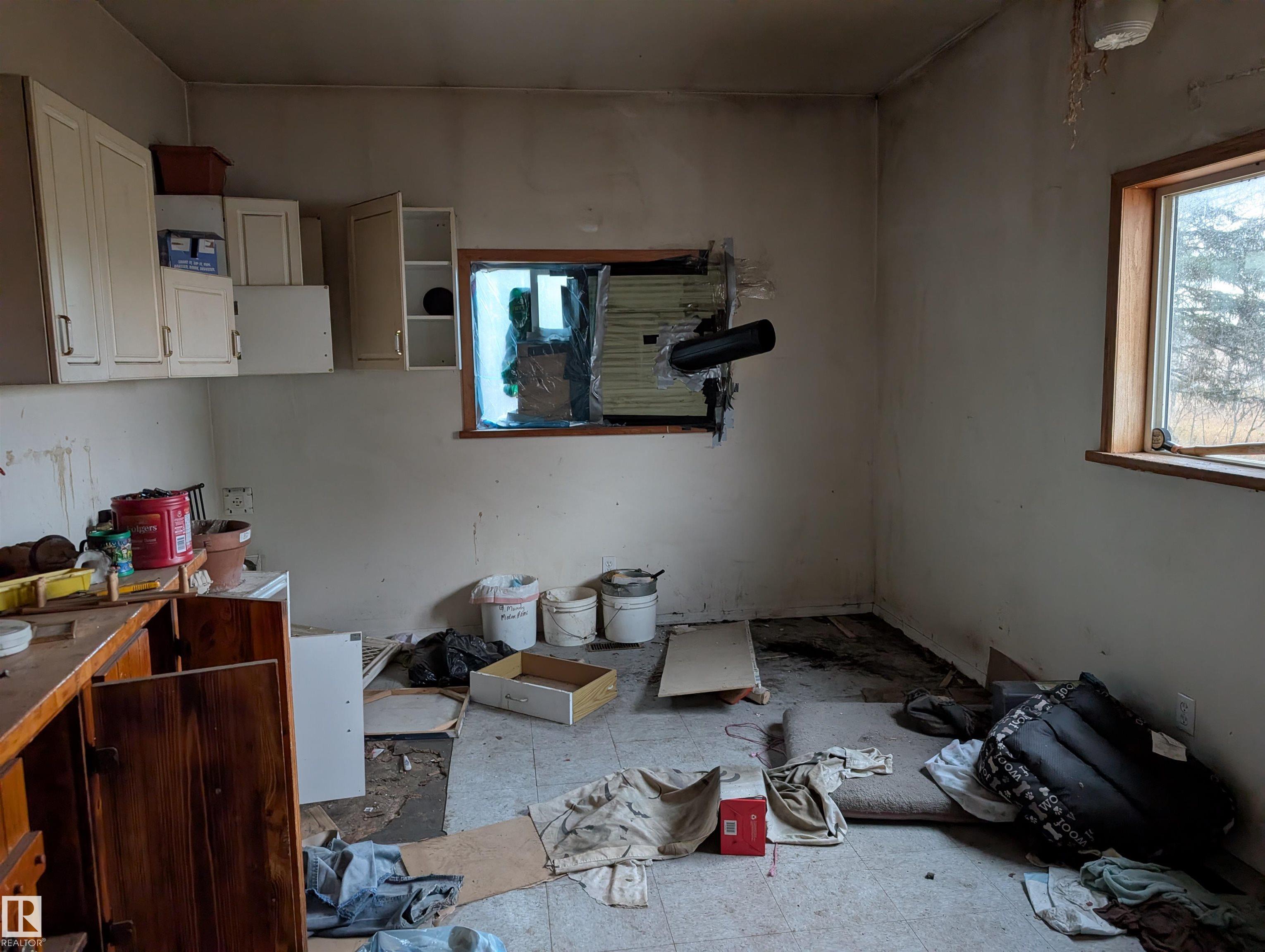 Handyman special- 1 bedroom up and 3 bedrooms down, 1 and a half bathrooms and large living room. 14.49 acres with 2 pole sheds, a barn and fenced in Thorhild county.