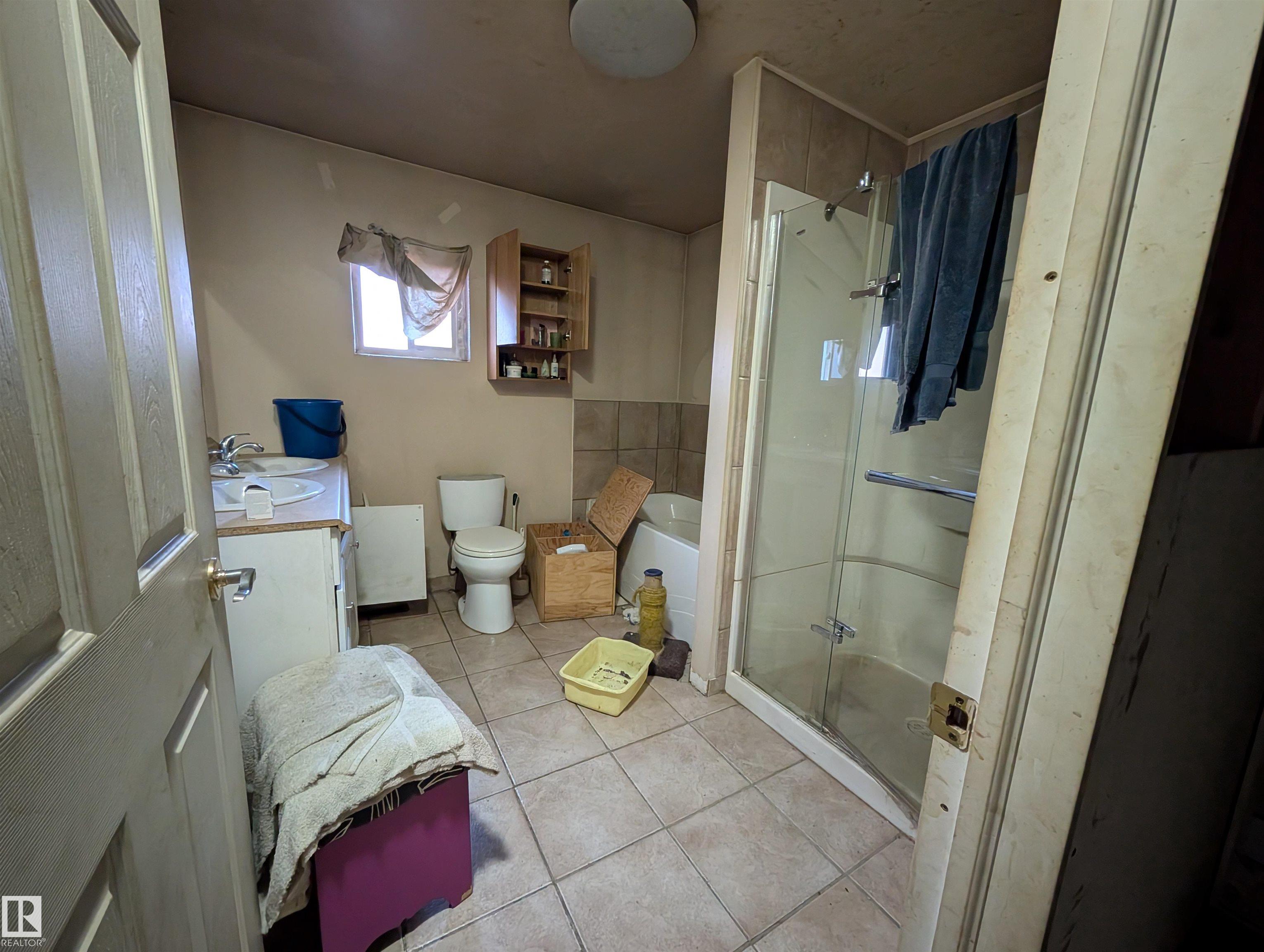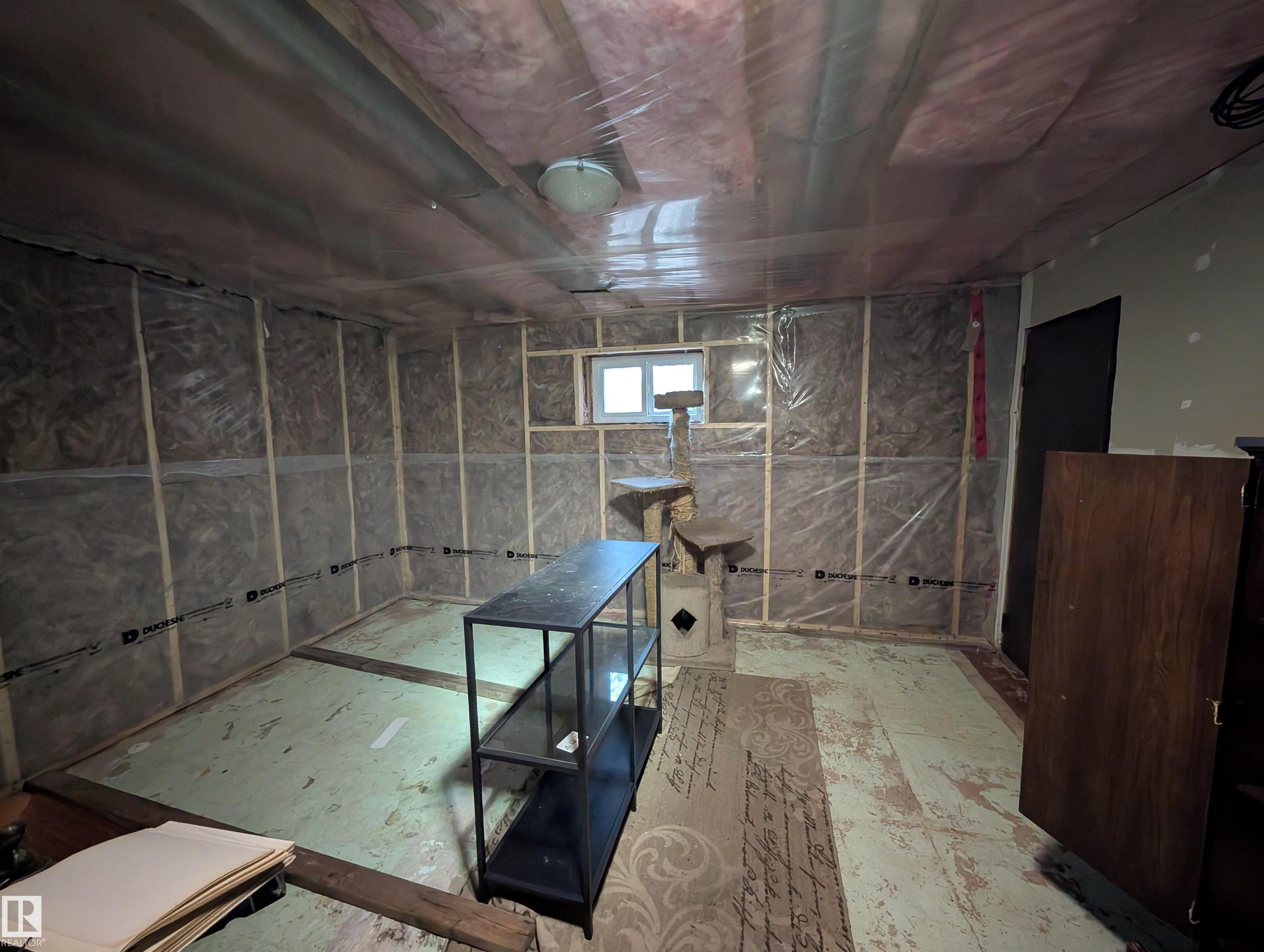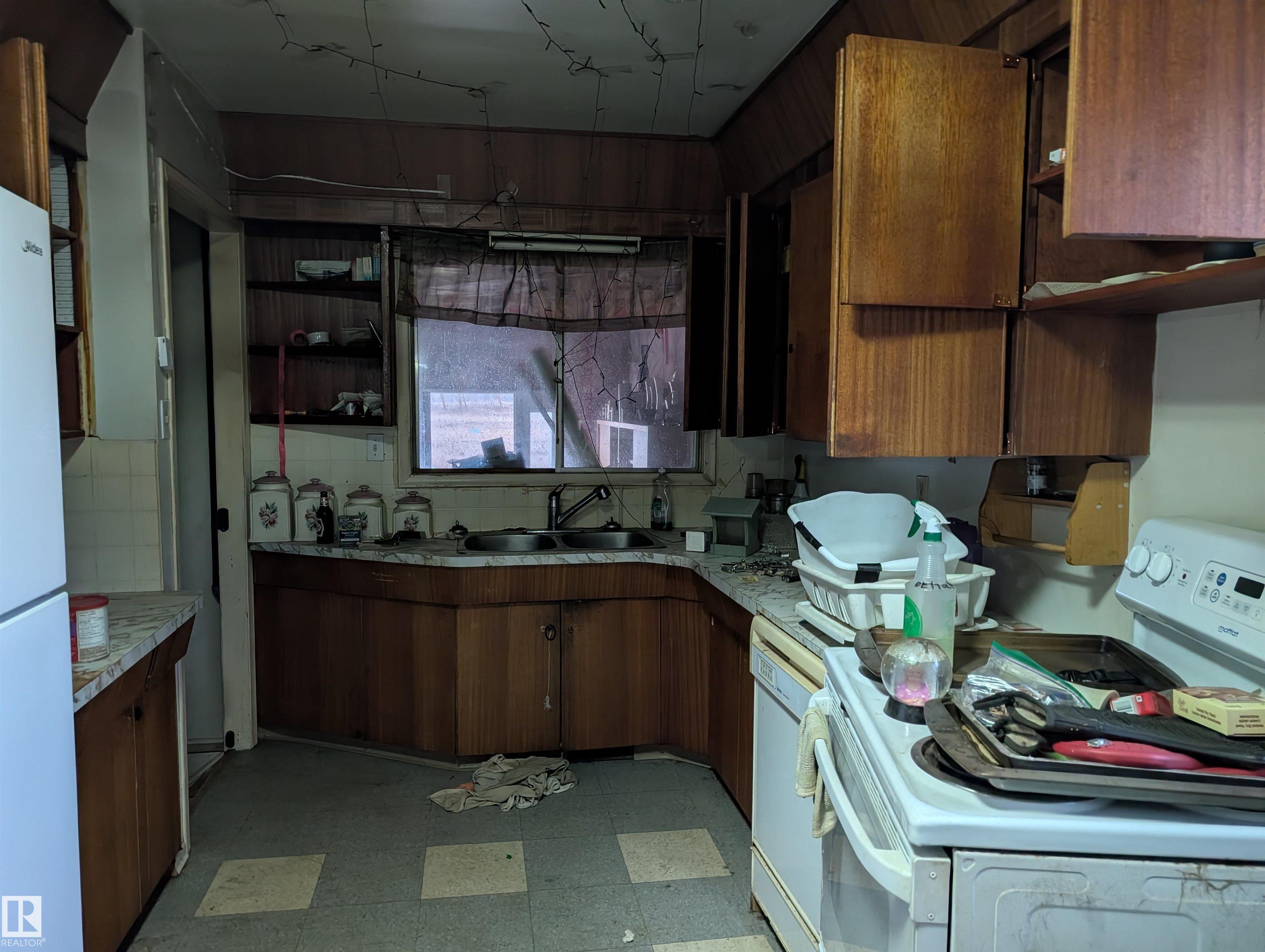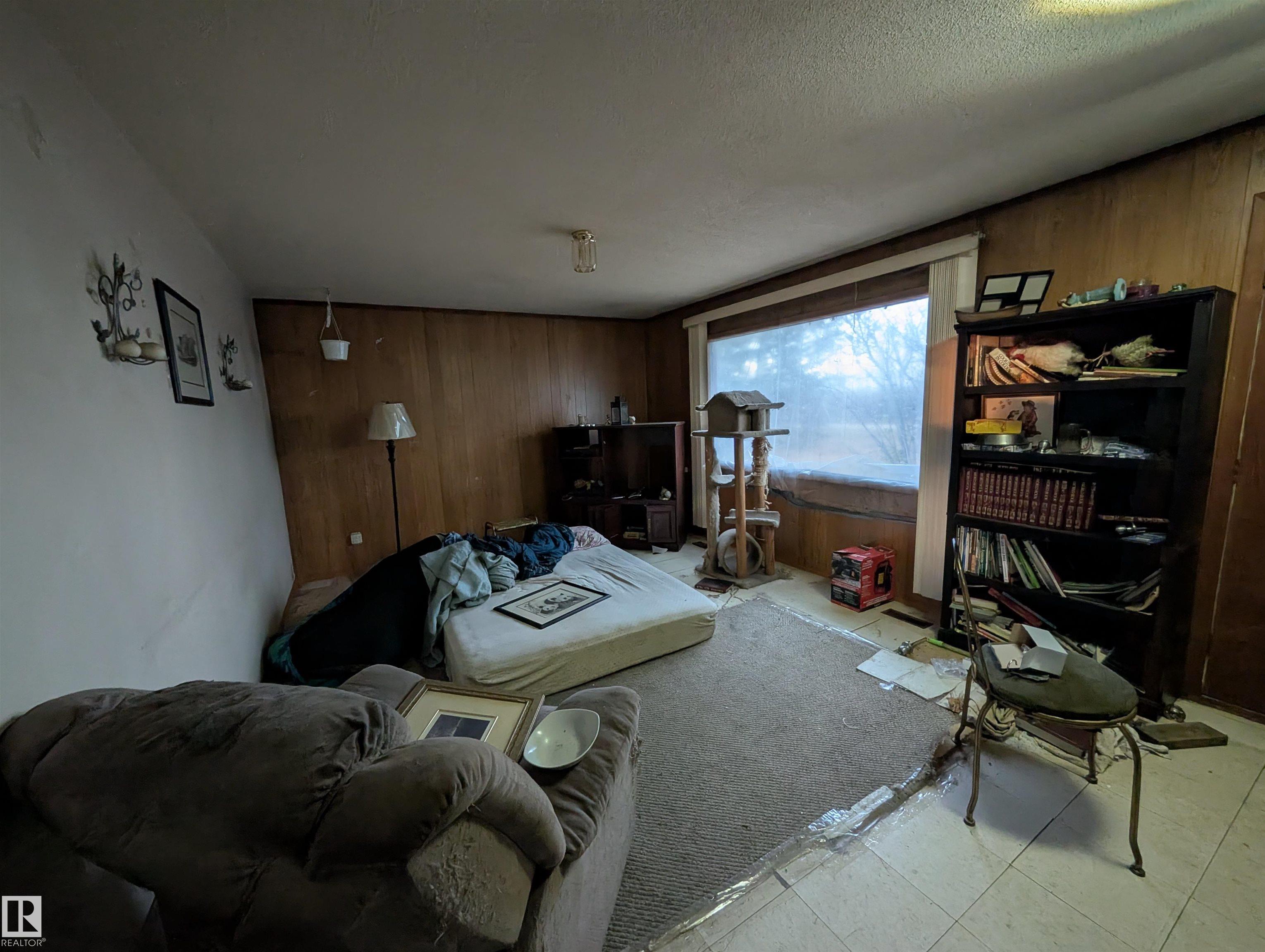 Handyman special- 1 bedroom up and 3 bedrooms down, 1 and a half bathrooms and large living room. 14.49 acres with 2 pole sheds, a barn and fenced in Thorhild county.